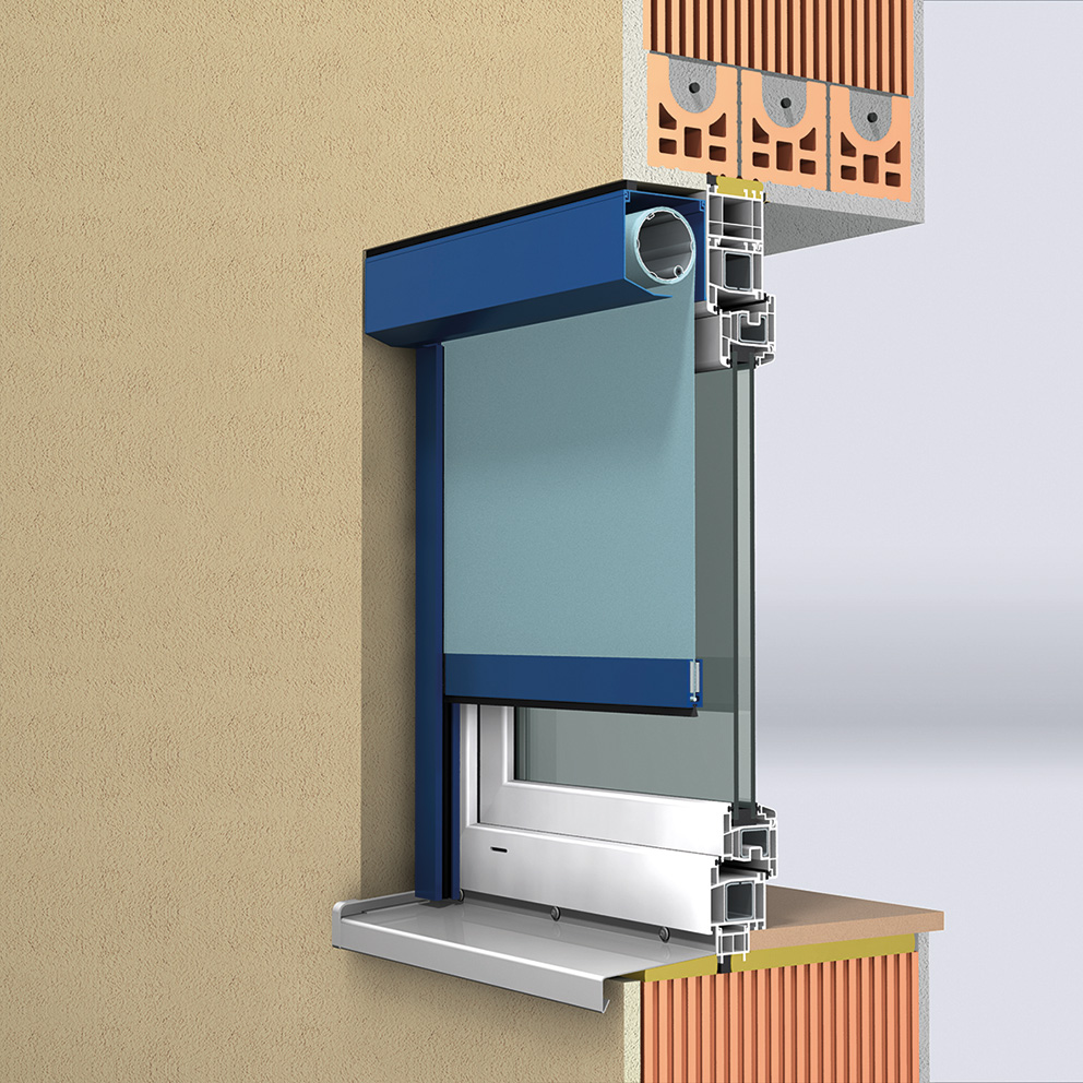 Für eine besonders dezente Optik können Putzträgerkästen eingesetzt werden. In Verbindung mit speziellen Putzträgerplatten lassen sich diese vollständig in die Fassade integrieren, sodass der Sonnenschutz harmonisch Teil der Gebäudehülle wird.